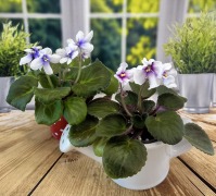 Цветы - двухтоновые осы. Лепестки цветов белые, глазок фиолетовый. Мега обильное цветение. Из одной пазухи может выходить по три цветоноса. Послушная розетка. Лист зубчатый, темный. Полумини или малый стандарт