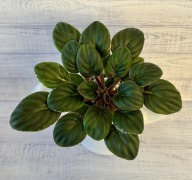 Бронзово-розовые полумахровые чашевидные звезды. Средне-зеленые ровные округлые листья. Полумини.