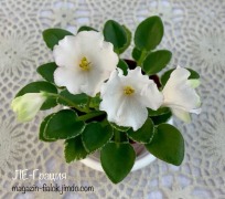 Белоснежные цветы с розовыми напечатками на кончиках лепестков,очень обильное и продолжительное цветение. Прекрасная плотная ровная розеточка округлых пестролистных листьев - просто загляденье! Редкий сорт. Мини