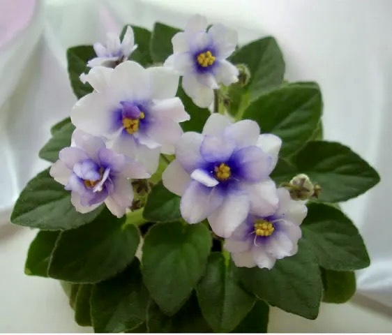 Махровые, белые звезды с сине-голубым центром. Светло-зеленый заостренный лист. Обильное и длительное цветение. Мини