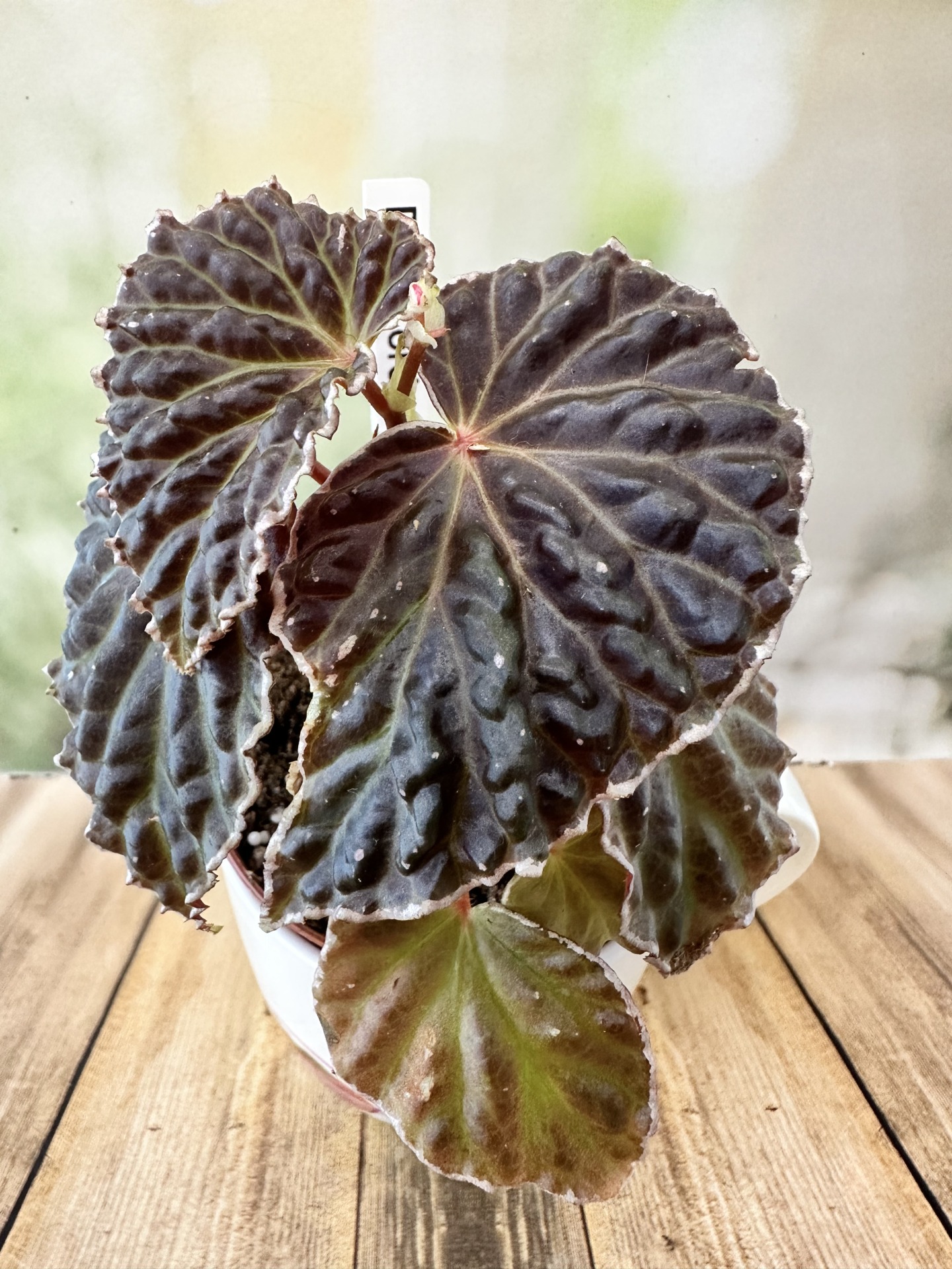 Новая, очень редкая бегония, гибрид двух природников darthvaderiana X dracopelta. Листья черные, бархатной структуры, очень благородного оттенка, с тонкой светлой окантовкой