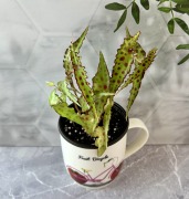 Природная бегония с шикарными листьями, отличается от первого вида расцветкой - листья горчично-шоколадные с зелеными продольными хаотичными полосками. Очень эффектная и благородная
