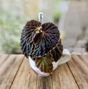 Ризомная бегония, среднего размера, хорошо кустится. Цвет листьев черный, глянцевый. Форма листа - сильно резной кленовый лист с улиткой; короткие черешки бордового цвета. Неприхотлива