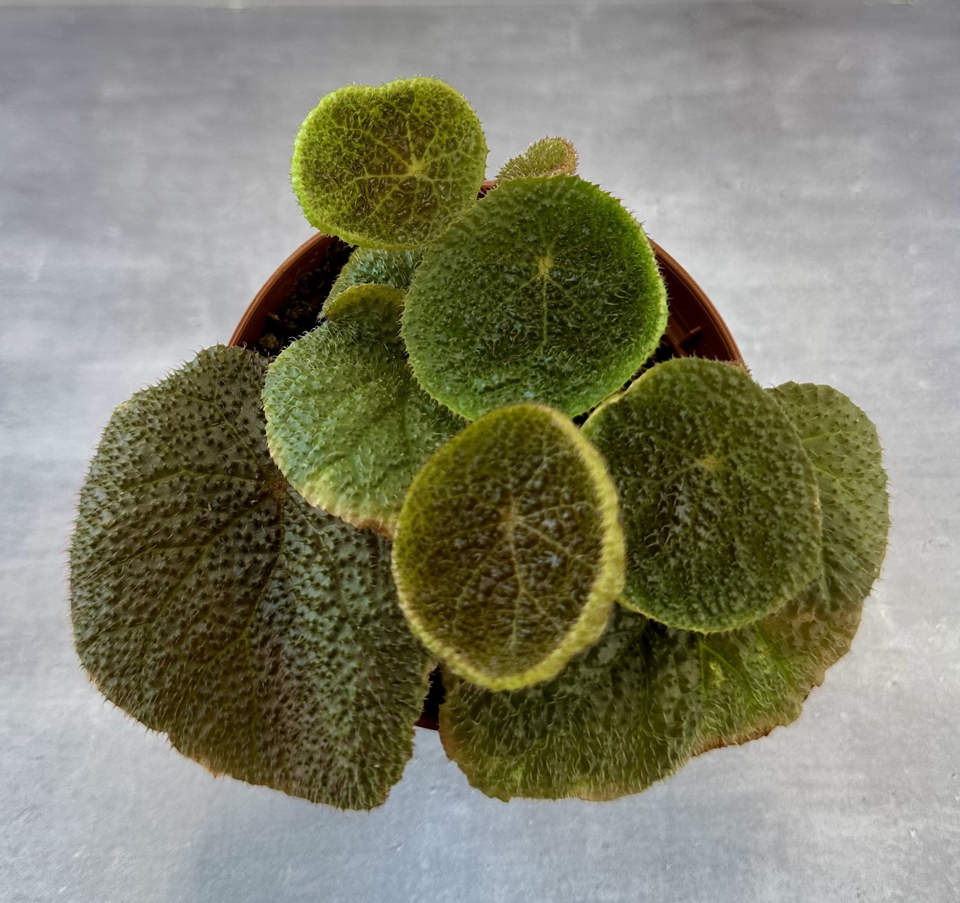 Природная ризомная компактная кустовая бегония. Листочки светло-зеленые, с возрастом окрас может меняться, края зазубренные, опушенные