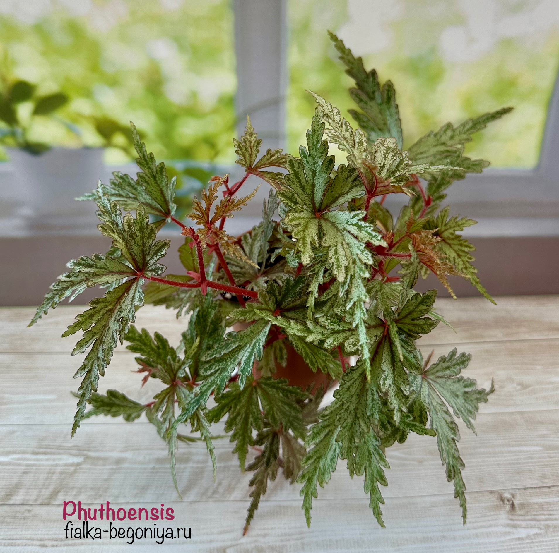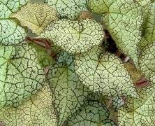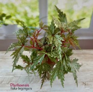Эта ризомная бегония привлекает внимание рассеченной листвой, в расцветке которой присутствуют серебристые, бордовые, зеленые тона, а так же красного цвета жилками. Родина – Северо-Восточная Индия, Непал.