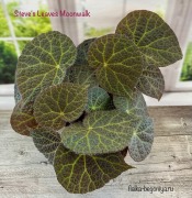 Природник. Бегония с сочным укороченным и опушенным стеблем, стелющимся по земле. Интересный, нетипичный окрас, листья крупные, округлые, слабозазубренные по краю, от темно-зеленого до почти черного, в середине листа темная полоса.