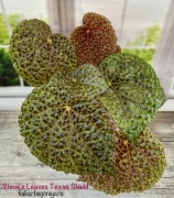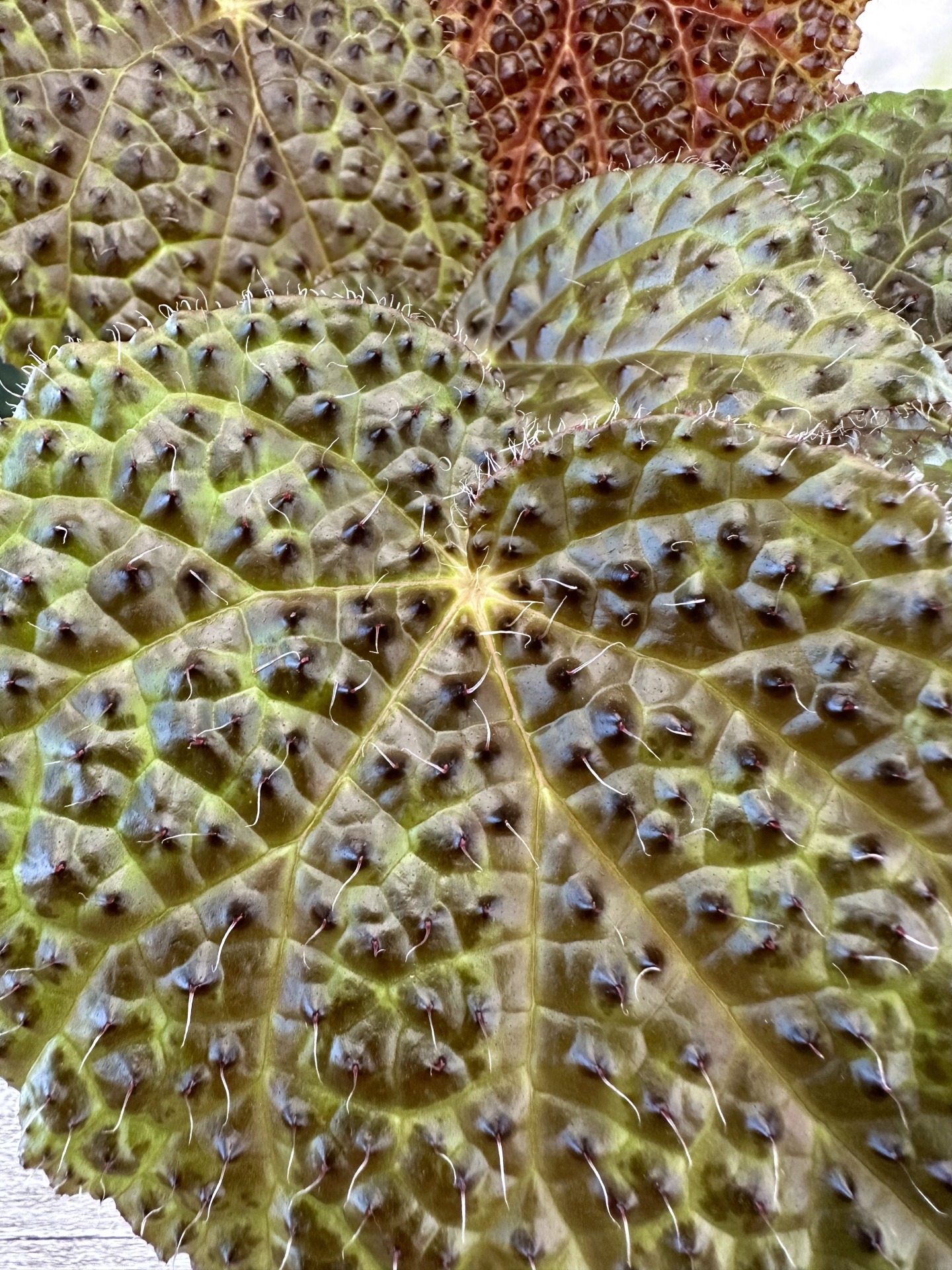 Новинка из Америки. Поразительный корневищный гибрид от компании Steve's Leaves. У него средние и крупные листья овальной формы, заостренные на кончике. Листва бронзово-зеленая, покрыта маленькими пузырьками, каждый из которых увенчан одним волоском. Задняя сторона листа красная, а край листа покрыт красными волосками. Эта бегония имеет открытый рост и маленькие зеленоватые цветы, возвышающиеся над листвой. Этот сорт хорошо себя чувствует при ярком освещении и небольшой повышенной влажности. (Даррен Хеппель, 2020, Steve's Leaves Inc, Льюисвилл, Техас)