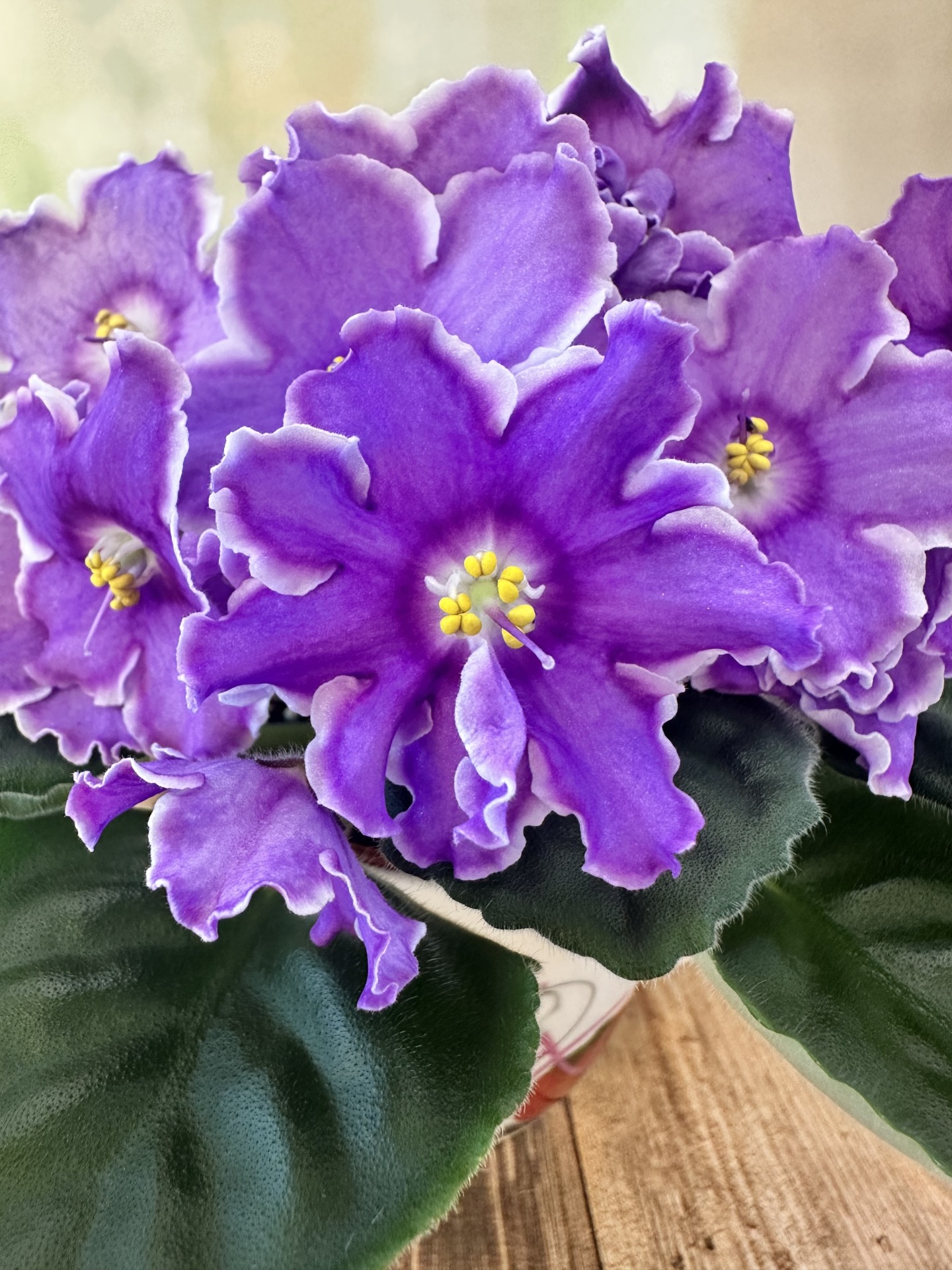 Махровые крупные белые цветы с сине-фиолетовой окантовкой. Аккуратная зеленая розетка. Шикарный спорт!