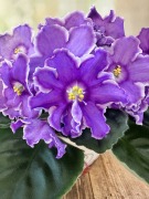 Цветы темно синего цвета с широкой белой каймой (до 3 см) с небольшими розовыми фэнтези на лепестках. Цветок диаметром 6,0- 6,5 см. Розетка компактная. Необычная форма цветков.