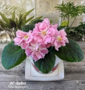 Крупные персиковые цветы с небольшим белым глазком и каймой. Пестрая розетка, крепкие цветоносы. Обильное и продолжительное цветение, цветки плотной фактуры. Неприхотлива к свету, одинаково формирует розетку и цветоносы как на ярком освещении, так и с краю полки.