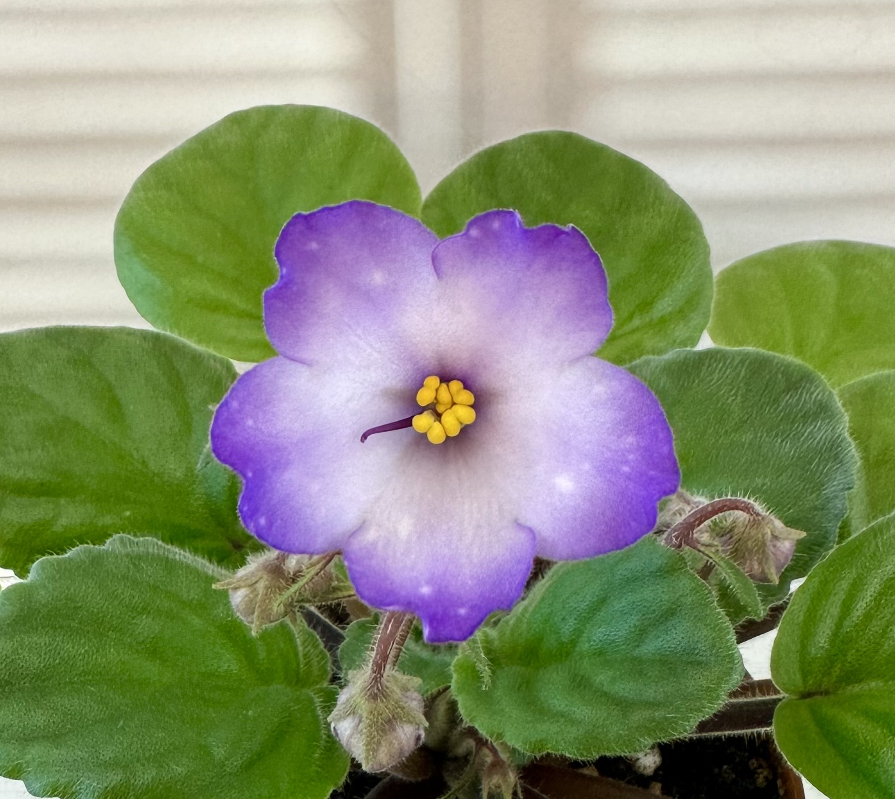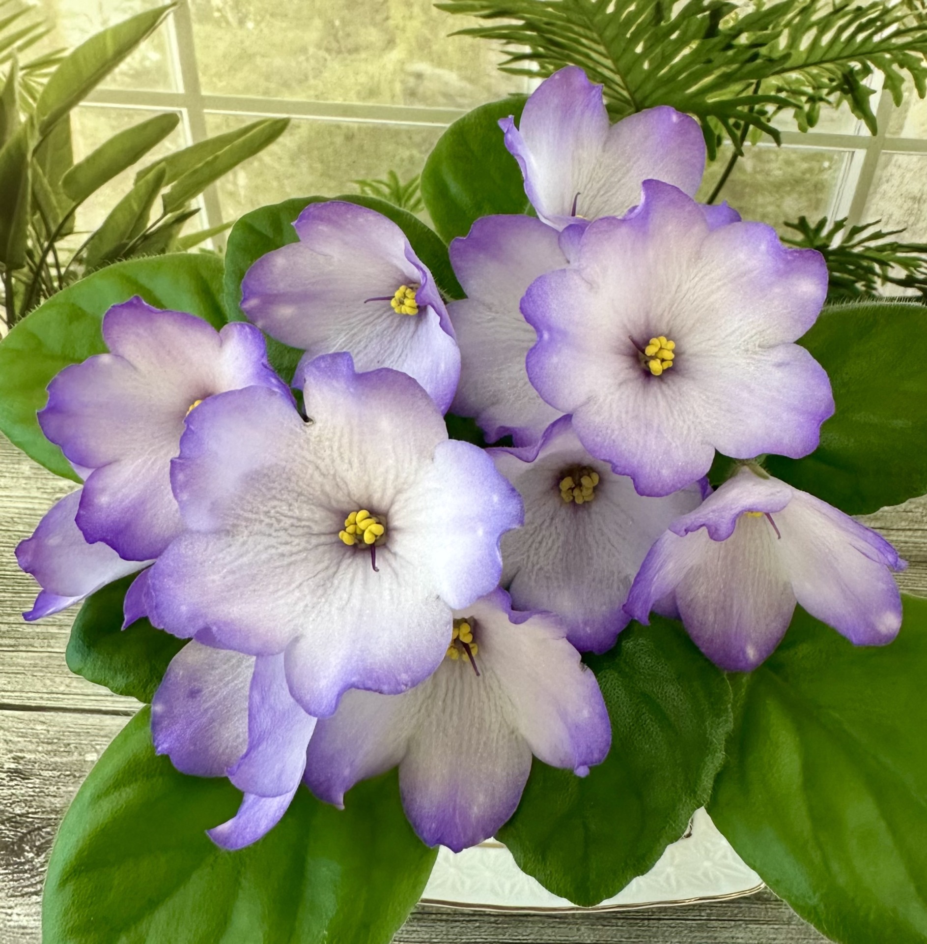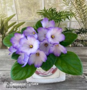 Крупные колокольчики нежно-лавандового цвета, постепенно переходящего в тёмный на кончиках лепестков, со светло-коралловым и белым фэнтези горошком. Продолжительное обильное цветение, крепкие цветоносы. Светло-зелёная листва. Окрас не зависит от температуры.