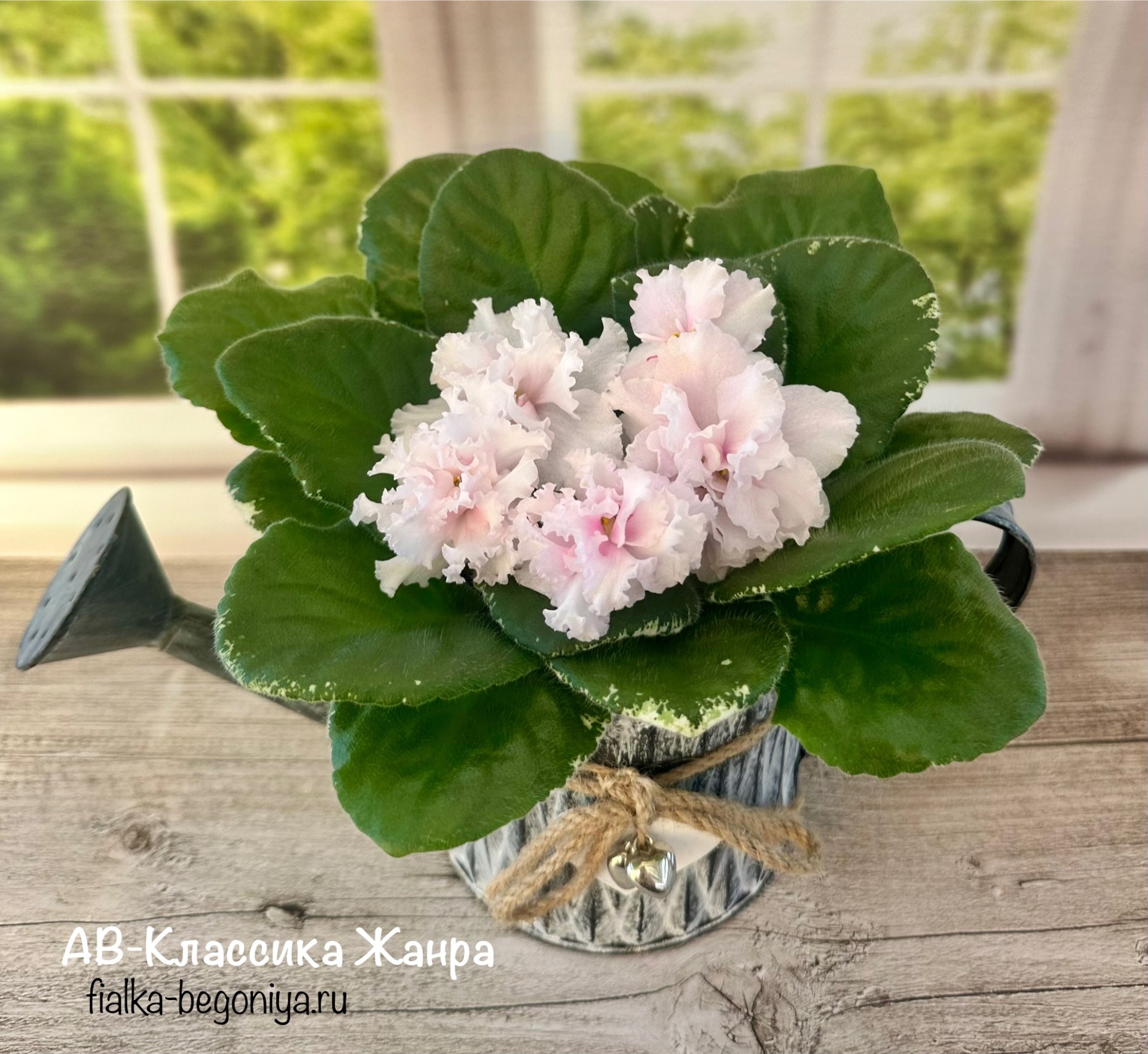 Крупные махровые воздушные цветы-шары с розовым глазком. Обильное цветение. Изумрудно-зеленые стеганные листья с бело-салатовой пестролистностью. 2022