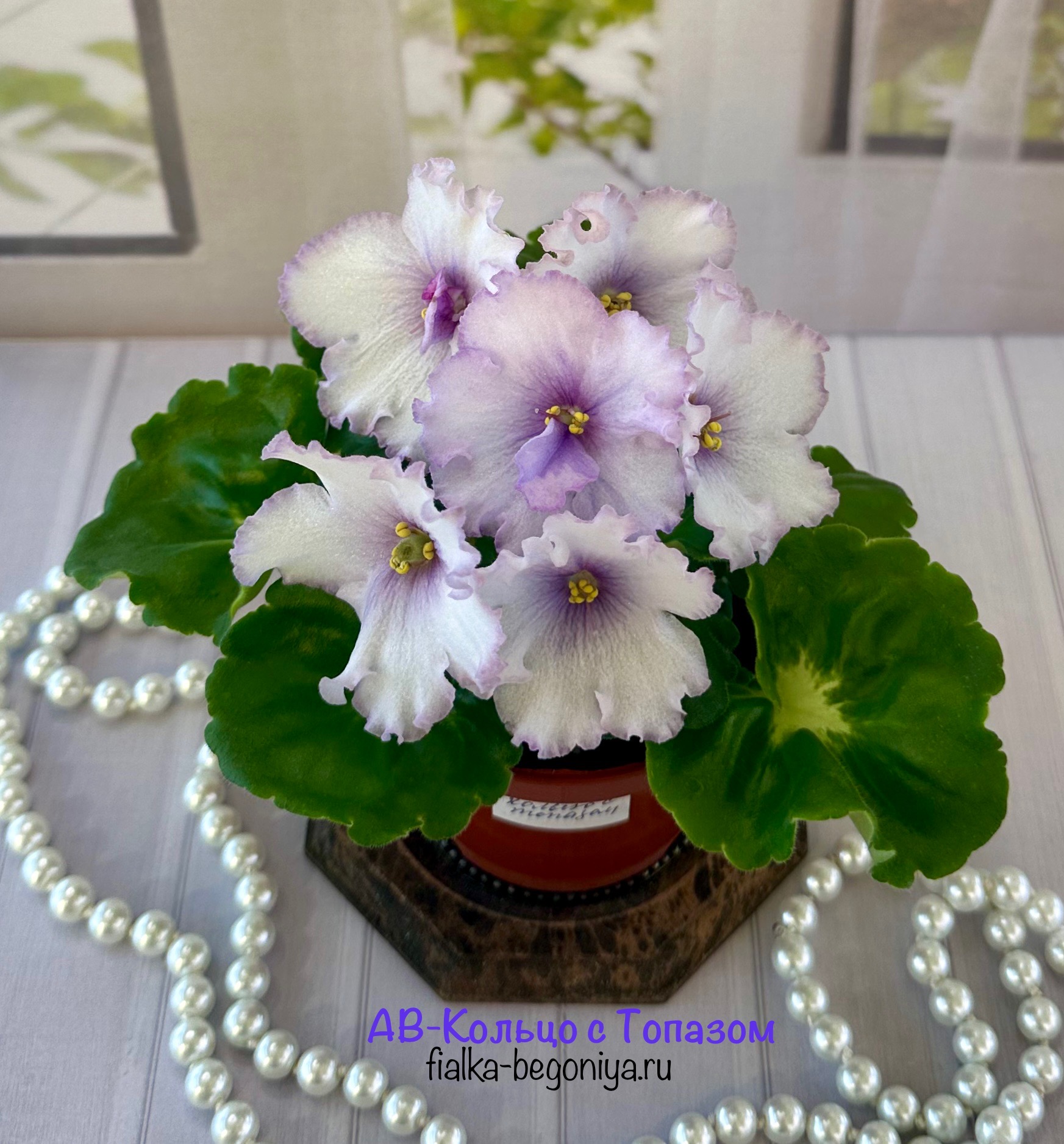 Очень крупные белые простые и полумахровые волнистые звезды с сиренево-розовой каймой и глазком-ореолом. Средне-зеленые ложковидные герл-листья. Компактная розетка. 2020