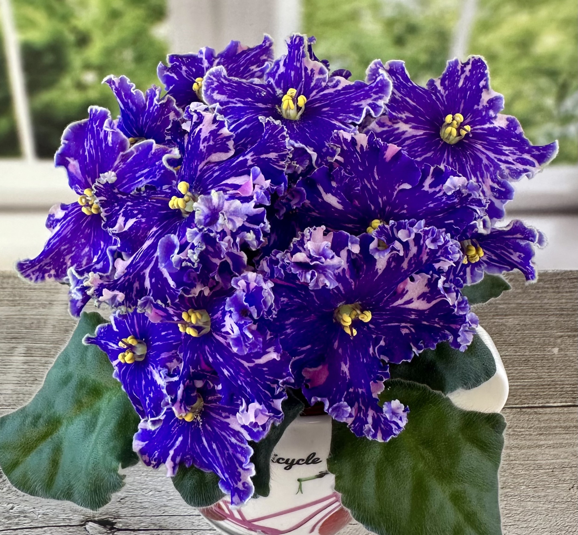 Очень крупные простые опадающие синие гофрированные звезды с розовым фэнтези и зеленым рюшем. Средне-зеленые, зубчатые, стеганные, слегка волнистые листья. 2022