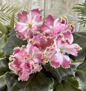 Цветы упругие и налитые. Махровые светло-розовые цветы с более темной фантазийностью. Золотистая кайма. Розетка из темно-зеленых листьев.