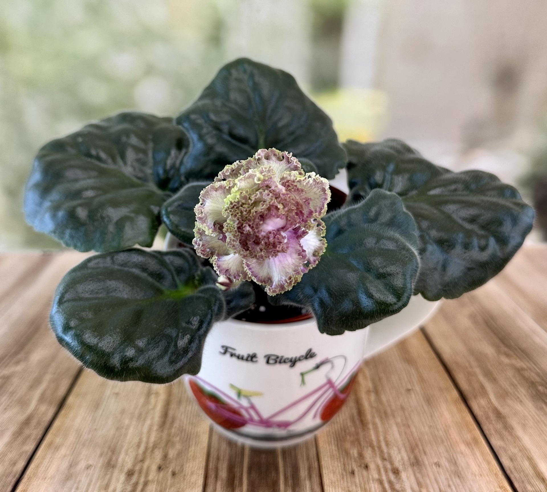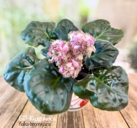 Цветы упругие и налитые. Махровые светло-розовые цветы с более темной фантазийностью. Золотистая кайма. Розетка из темно-зеленых листьев.