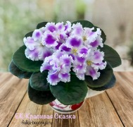 Крупные махровые белые цветы с малиново-пурпурным пятном на каждом лепестке, зеленца по краю лепестков. Насыщенно-зелёная выставочная розетка из заострённых листьев. Не фиалка, а красивая сказка! 2016