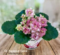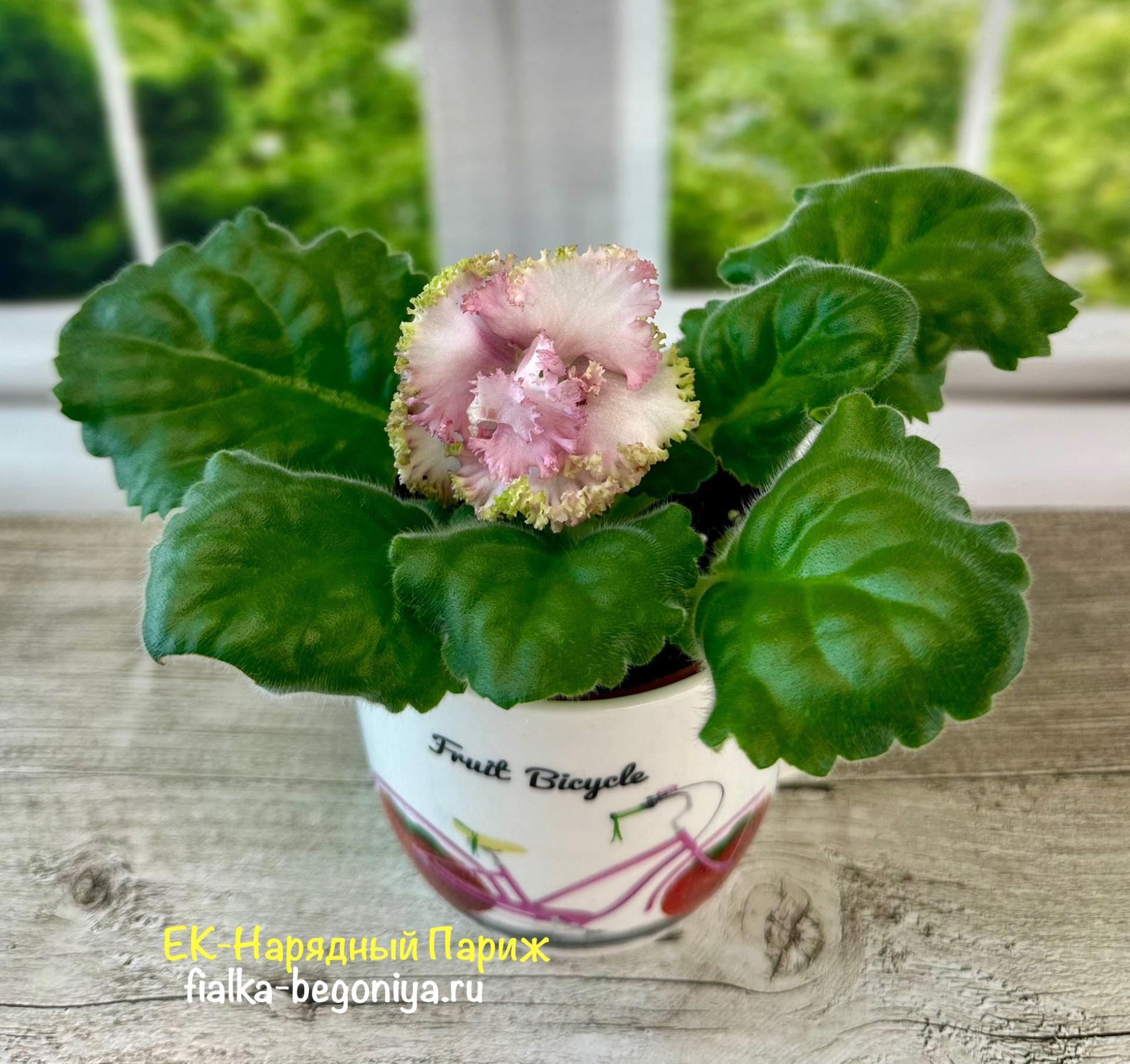 Очень крупные махровые розово-белые цветы с густой зелёно-бронзовой бахромкой. По мере роспуска цветки превращаются в помпоны. Выставочная розетка из слегка волнистых насыщенно-зелёных фестончатых листьев. 2023