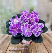 Огромные (более 6 см) полумахровые белые цветы с чёткими пурпурными пальчиками на лепестках. Красивая розетка из насыщенно-зелёных округлых листьев. Очень яркие и контрастные цветы образуют пышную шапку над выставочной розеткой!