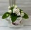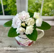 Маленькая компактная розетка удлиненных пестрых листьев, букет белых с розовыми тенями колокольчиков.