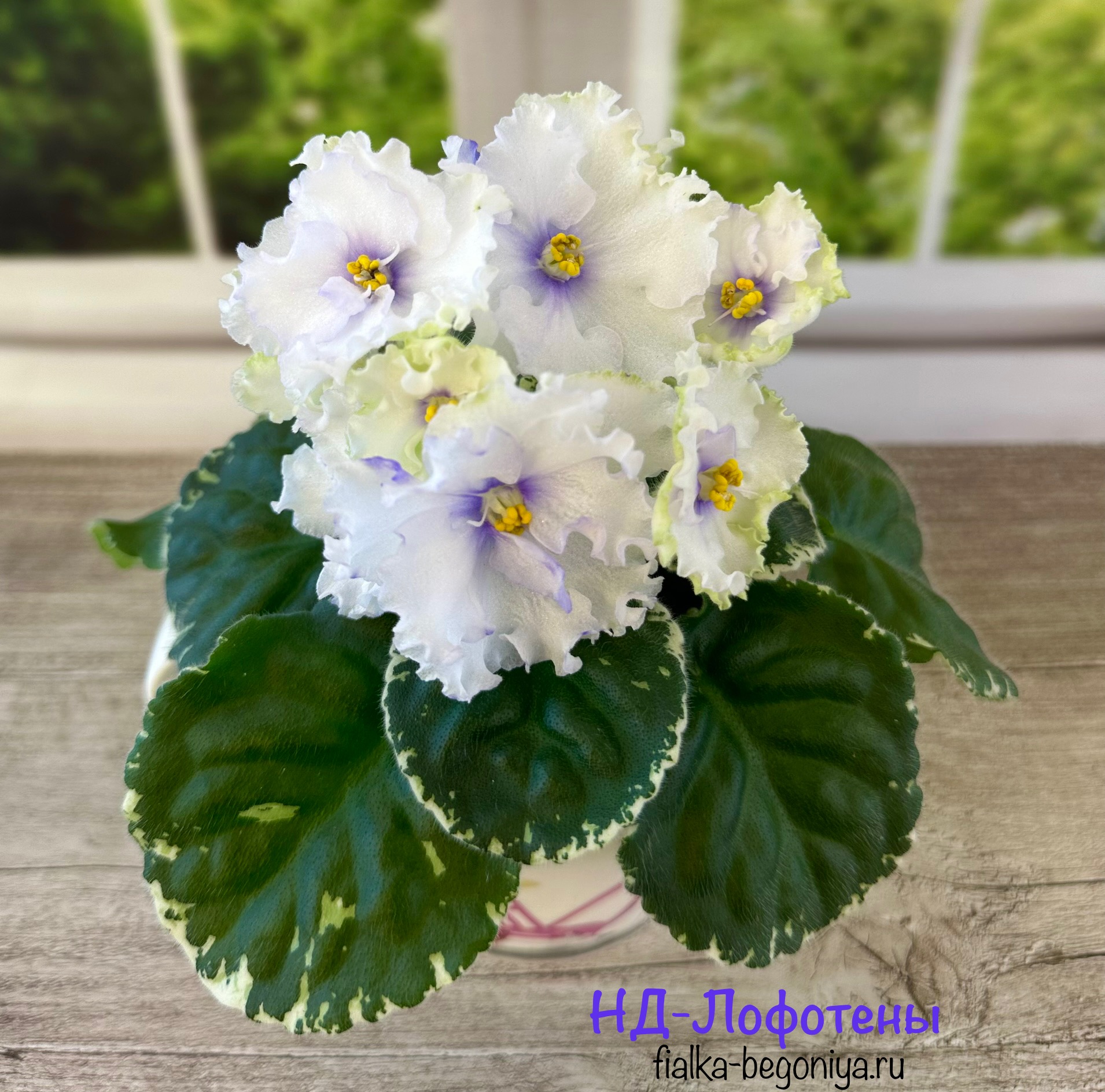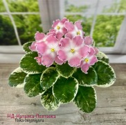 Полумахровые крупные белые звёзды с ярко-розовыми напечатками и обильным синим фентази по ним. Цветы яркие даже в прохладе! Красивая розетка светлых пёстрых листьев. Очень нарядный сорт! 2018 г.