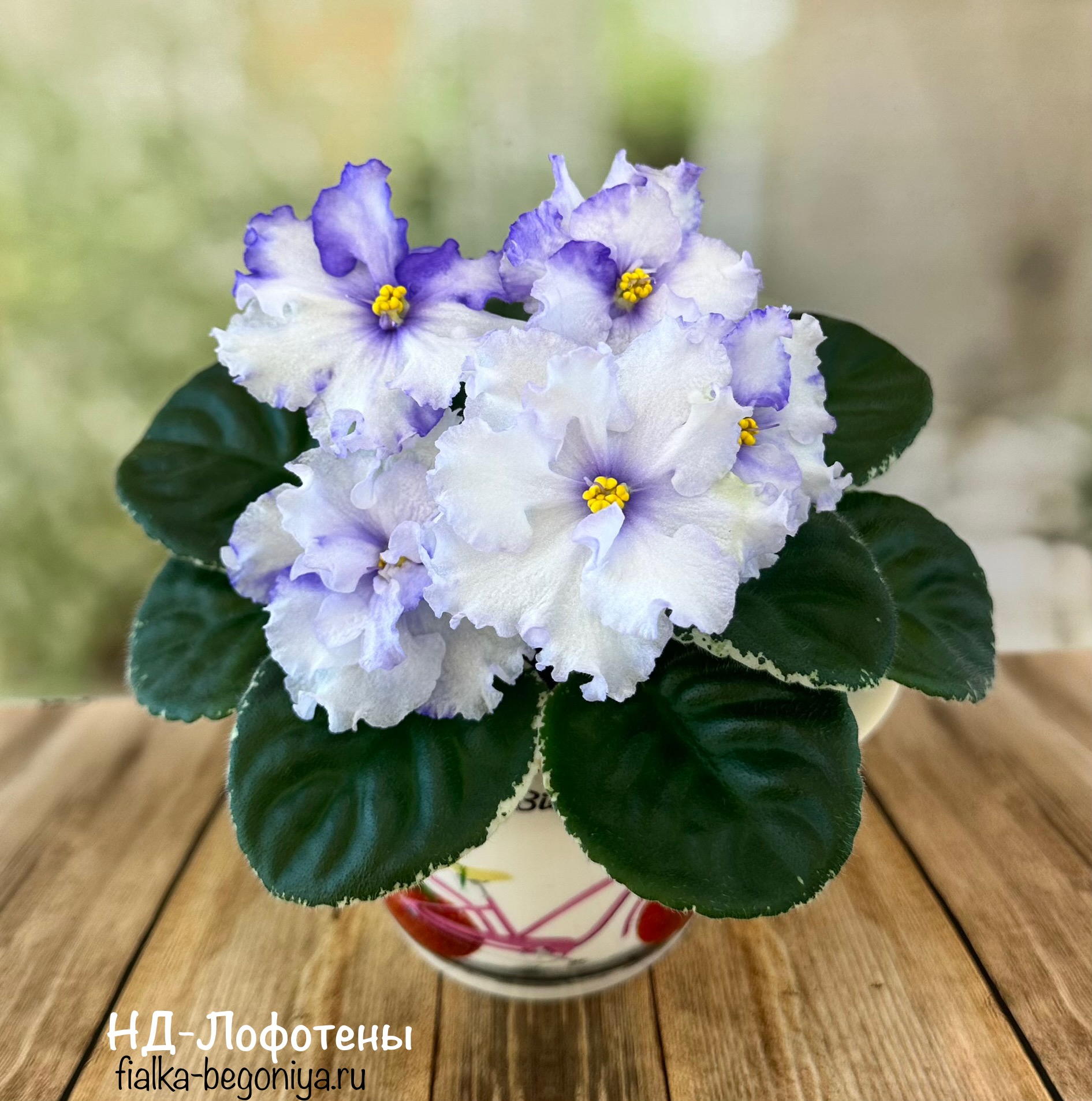Густомахровые, рюшастые сине-фиолетовые цветы-розочки очень плотной фактуры контрастно смотрятся на слегка волнистой пестролистной розетке.