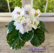 Морозно-белые с лёгким лиловым отсветом полумахровые цветы с тёмно-лавандовыми кончиками лепестков, пронизанными узорами в виде сеточки. Тонкая белая кайма по краю лепестков. Розетка красивых пёстрых листьев гармонично вторит лилово-лавандовыми оттенками. От сорта словно веет прохладой и чистотой. 2018