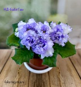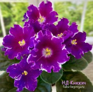 Густо-махровые волнистые сине-фиолетовые цветы, на лепестках обильное светлое фентази, белый глазок и двойная кайма (белый и пурпур). Ровная розетка средне-зелёных, чуть удлиненных листьев. 2019
