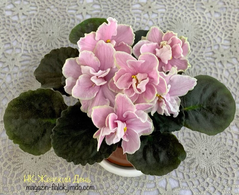 Полумахровые и махровые, розово-пастельного тона цветы с утолщённой белой (иногда зеленоватой) каймой. Темно-зеленая ровная компактная розетка.
