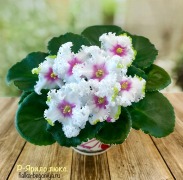 Полумахровые белые цветы с темно-синим пятном в центре и зеленой каймой, растягивающейся в шикарный воланистый край. Розетка ярко-зеленых с белым краем листьев. Очень долго цветет.