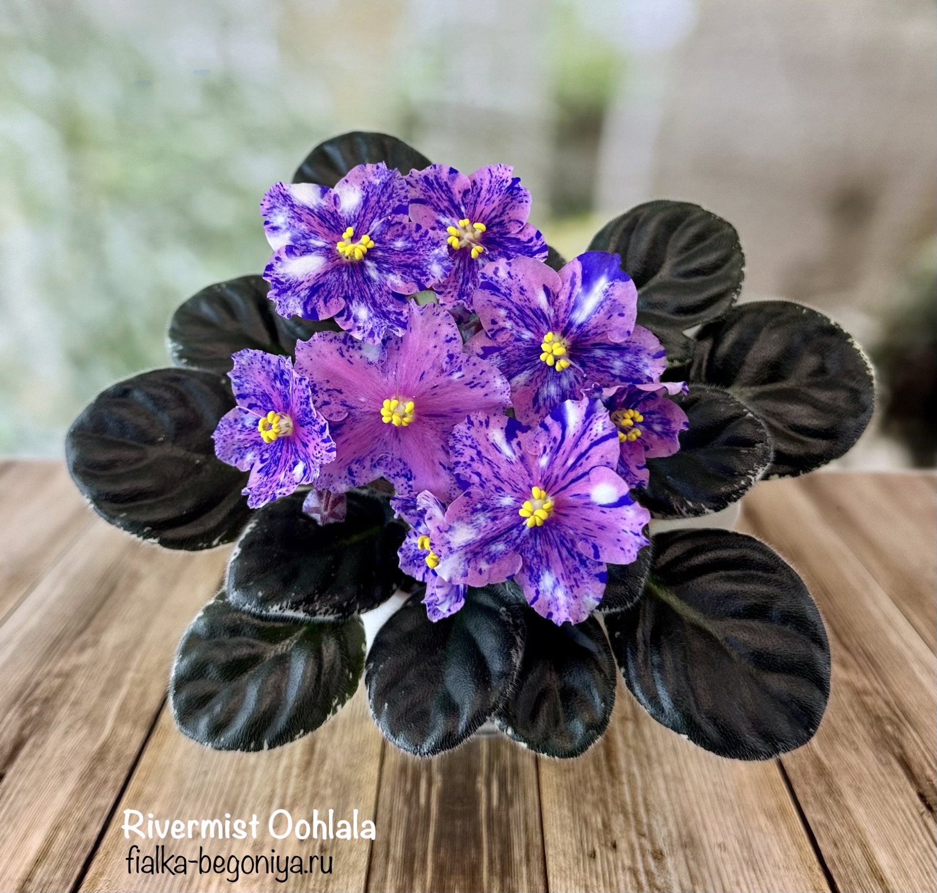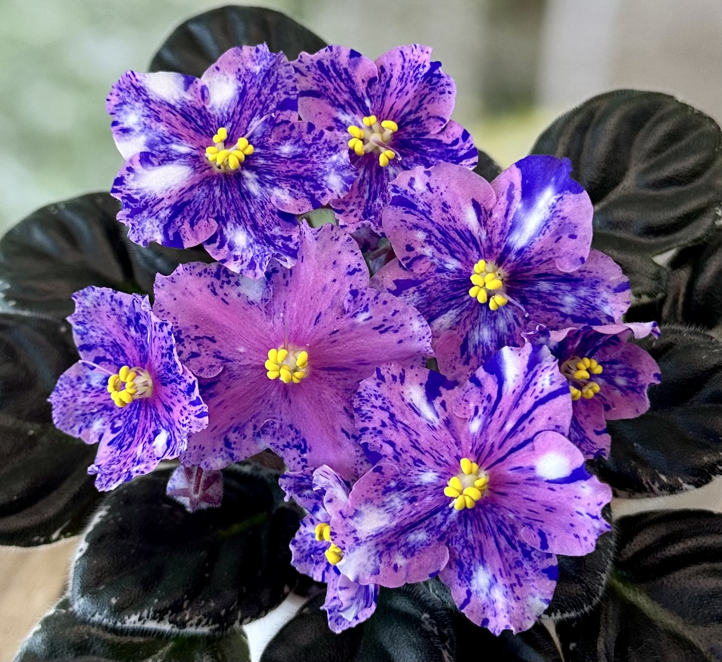 Простые и полумахровые сине-фиолетовые крупные звезды с белыми горошками фэнтези и темно-розовыми прожилками. Пестролистная темно-зеленая розетка, листва кремово-розовая, округлая, стеганая с красной изнанкой