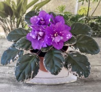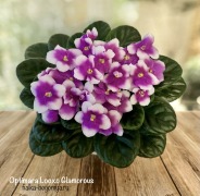 Крупный белый цветок 5-6 см диаметром, украшенный по краю широкой сине-фиолетовой окантовкой. Лепестки цветка - чуть курчавые. Цветет шапкой. Сочетание белого и сине-фиолетового очень ярко и нарядно. При любых условиях образует идеальную розетку размером 20-24см, которая долго цветет и не занимает много места.
