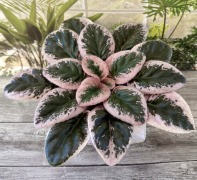 Полумахровые средне-розовые оборчатые звёзды с более тёмным фэнтези. Тёмно-зелёная с розовым и коричневым пёстрая зубчатая листва. Очень красивый пестролистник. Цветы полумахровые, нежно-розовые с белыми и желтоватыми разводами.