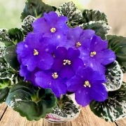Полумахровый небесно-голубой цветок с волнистыми лепестками; небольшая темно-зеленая розетка герл листиков с мозаичной пестролистностью. Полумини или малый стандарт